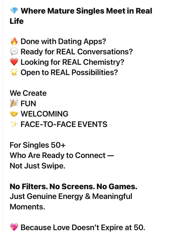 This is more than just a singles gathering — it’s a refined social experience created specifically for singles over 50.